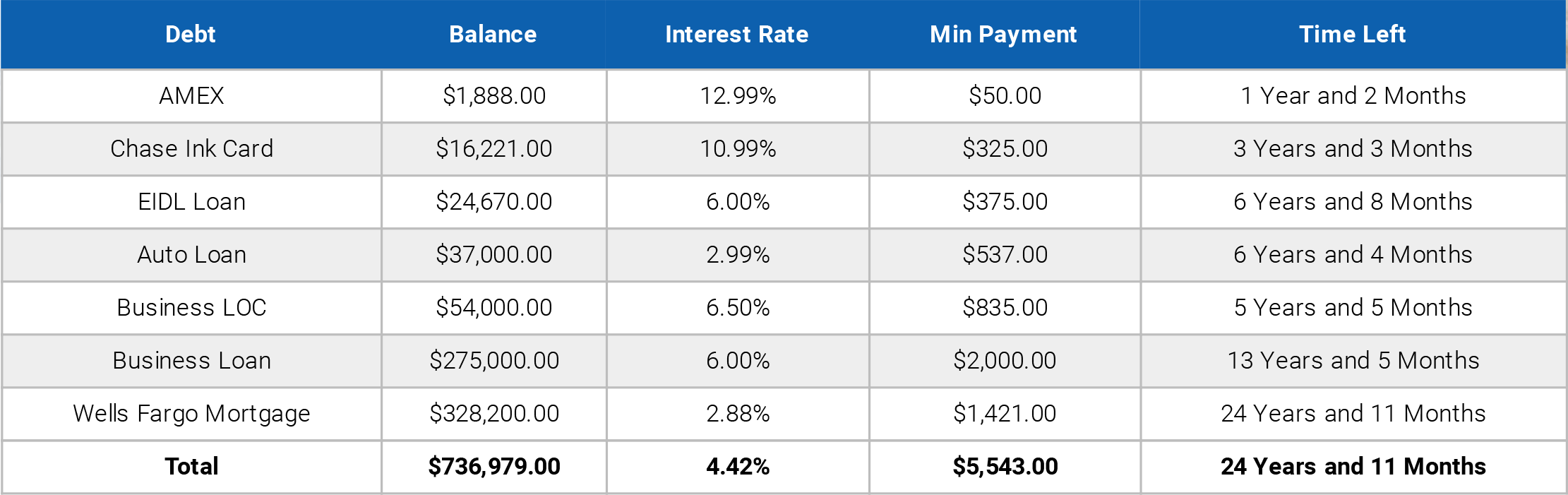 By redirecting $5,543.00 of your money and making minimum payments to debts, your Equity XLerator™ Plan will have you 100% debt-free in 7 Years and 7 Months instead of 24 Years and 11 Months . You will accomplish this without spending any more money than you were before!