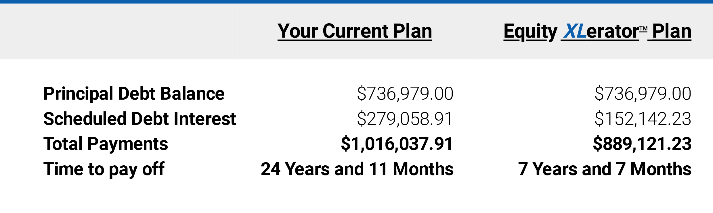 Its not magic, just math combined with a few simple strategies that can free-up cash flow quickly and build significant wealth over time. Using the information that you provided, we have compared your current financial plan with the strategies outlined in the Equity XLerator™ Plan. Below are the time and financial savings you can expect by implementing this plan.