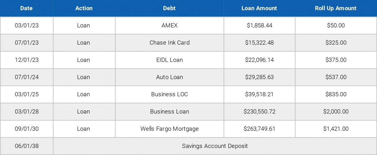 Below are important dates in your Equity XLerator™ Plan to stay on track and meet or even exceed your projected timing for financial freedom. Each date listed below is when you need to take an account loan to pay off a debt. Once the loan is taken out, you will redirect the freed-up payment to pay back the loan to your account. You are now paying yourself instead of making payments to a creditor.